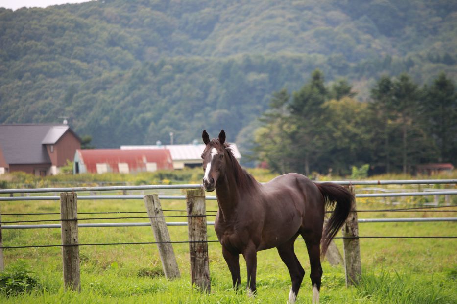ラバーの放牧地で、数名の会員さんと人参をあげていると、遠くてこちらを見つめるベガ。