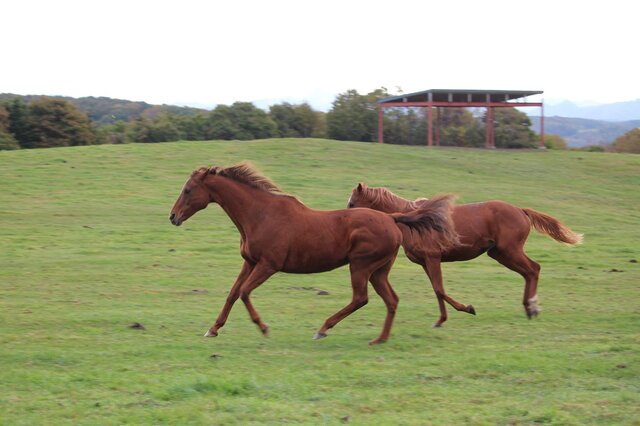 朝、放牧地に轟く蹄の音