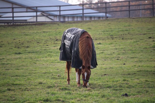 ウインダムが1頭で草を食べているところにレディーちゃんが、