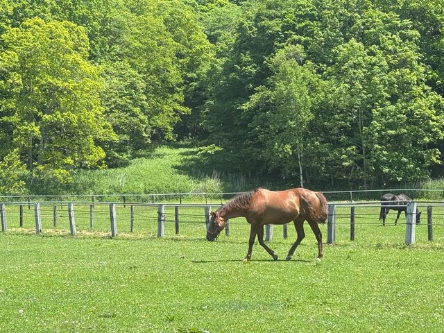日中は虻を避けるため、厩舎で過ごしています